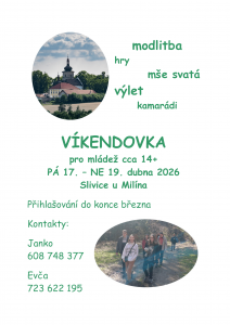 Zveme tě na víkendovku pro mládež cca 14+, která se uskuteční v termínu PÁ 17. – NE 19. března 2026 ve Slivici u Milína. Náplní budou hry, výlet, modlitba, sdílení, vaření, mše svaté, přednáška na duchovní téma (přijede na chvíli i pan farář), rozjímání a cokoli dalšího, co budeme chtít. Pro více informací a přihlašování kontaktuj Janka nebo Evču (kontakty níže) anebo doraž na příští setkání spolča ;-P